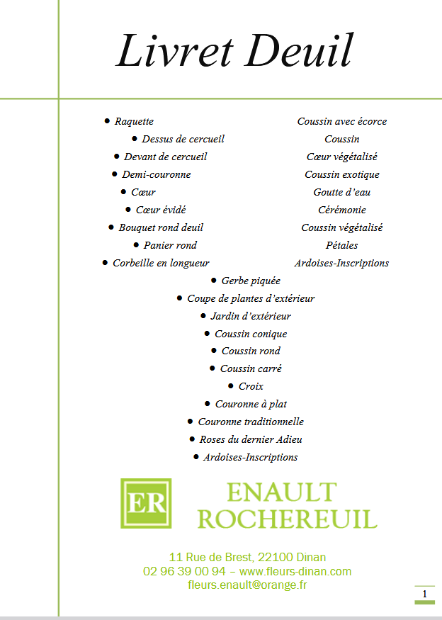 Dans ces moments douloureux pour les familles, Enault Rochereuil s’efforce de proposer le service le plus complet possible. Nous vous proposons toute une série de services et compositions florales (dessus de cercueil, devant de tombe, coussin rond, coussin conique, gerbe à la main, gerbe piquée, raquette, bouquet bulle, composition, cœur, croix, couronne, coupe de plantes).